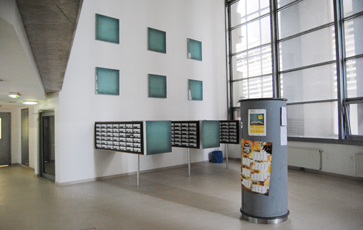 In jeder der elf Wohnetagen befinden sich rund 20 Wohnungen, die in 2er-Blöcke aufgeteilt sind. Dazwischen befindet sich Freiraum in der Breite von etwa einer Wohnung, welcher die denkmalgeschützte Gasometerfassade mit ihren hohen Fenstern sichtbar macht.